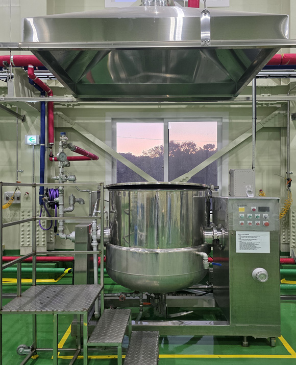 고온·고압으로 제품 전체를 살균하는 멸균기입니다. GPCO 팥 제품의 미생물 안전성과 상온 장기 보존 능력을 보장하는 핵심 설비입니다.